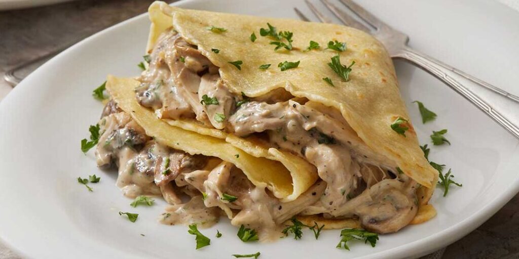 Descubre cómo preparar deliciosos crepes de pollo con una irresistible salsa de champiñones en esta fácil y sabrosa receta. ¡No te la pierdas!